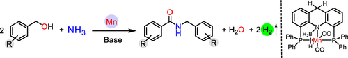17. P. Daw, A. Kumar, N. A. E. Jalapa, D. Milstein, Direct Synthesis of Amides by Acceptorless Dehydrogenative Coupling of Benzyl Alcohols and Ammonia Catalyzed by a Manganese Pincer Complex: Unexpected Crucial Role of Base, J. Am, Chem. Soc., 2019,141, 12202-12206.
